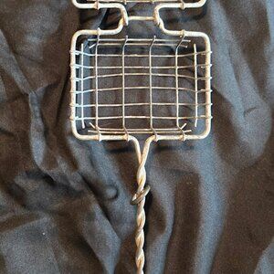 Vintage (rare find) stainless steel soap cage/soap shaker/soap saver originally used during times of rationing items...food and other household necessities. Modern versions are available today. This particular vintage dispenser ages back to the 1940's. It's in very good condition considering its age. So cool to wonder who used this during its peak. Little bits of used soap would be placed in the cage, closed with steel lock and used in water to suds up and prevent any bit of loss. Very practical...non-wasteful. DIMENSIONS: 10" long. Wood handle measures 4". Cage measures 3" x 3.5"