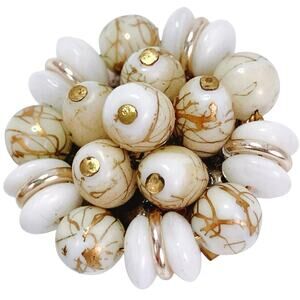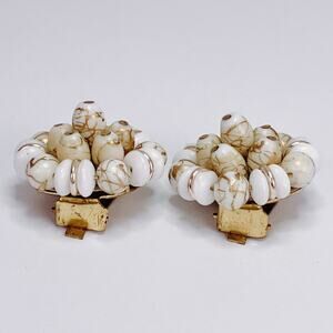Mid-century bead clusters from West Germany bring a chic dome silhouette with marbled glass and gold accents. Their neutral white-and-gold palette makes them versatile vintage staples.
