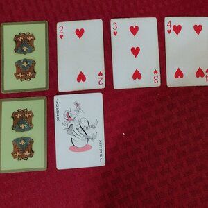This vintage treasure is ready to find a new home. Two decks of playing cards, in fair condition, specifics noted in deck description. It appears that the matted frame around the card might have been gold at one time. Several cards have “smudges” on the face of the card and “worn white spots” on the Coat of Arms side of the cards. The smudges on the face of the cards could be the matted frame of cards wearing against the face of the card