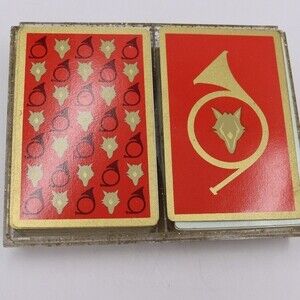 Vintage Stancraft Playing Cards Red & Gold Horns & Wolves in Plastic Case 2 Deck Set