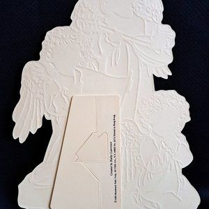 This charming greeting card features a trio of stand-up angels, making it an attractive addition to your holiday decor. Measuring 8.5 inches by 6.5 inches, this card's attention to detail and craftsmanship is sure to delight. Made in a Victorian motif, this unused card was created in 1989 by Kathy Lawrence. Obtained at an estate sale, it did not come with an envelope but will fit into a 9" x 7" envelope.