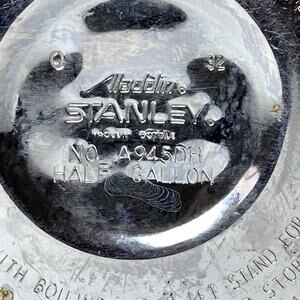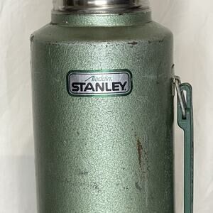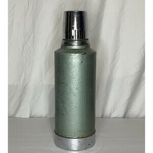 This vintage Stanley Aladdin Thermos (Model A945DH) is a classic 1-quart vacuum bottle made in Nashville, TN, by Aladdin Industries. With its iconic green hammer tone finish, stainless steel cup lid, and metal swing handle, this thermos is built tough for work, camping, or everyday rugged use. Designed to keep beverages hot or cold for hours, it's a great example of mid-century American utility design. This piece includes the original stopper. Functional, collectible, and perfect for vintage gear enthusiasts or retro kitchen decor.