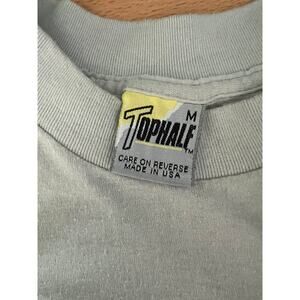 Vintage Stanley Desantis 1987 Frankenstein Bah-Humbug T Shirt. Light blue in color. Size Medium. Pit to pit approx. 18 inches; Length approx. 27 inches. Single stitch. Has a few light stains and small crack in the screenprint - see photos for more detail. I have additional photos but cannot load but so many on the platform. Message me if you want me to send more photos. I have not tried to fabric shave or strain treat; due to the age I did not want to wash it more than necessary.