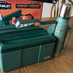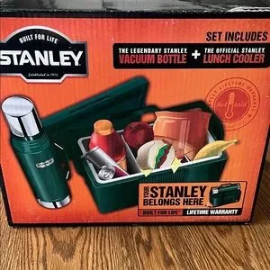 Durable Stanley set with vacuum bottle and cooler. Ideal for outdoor adventures.