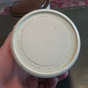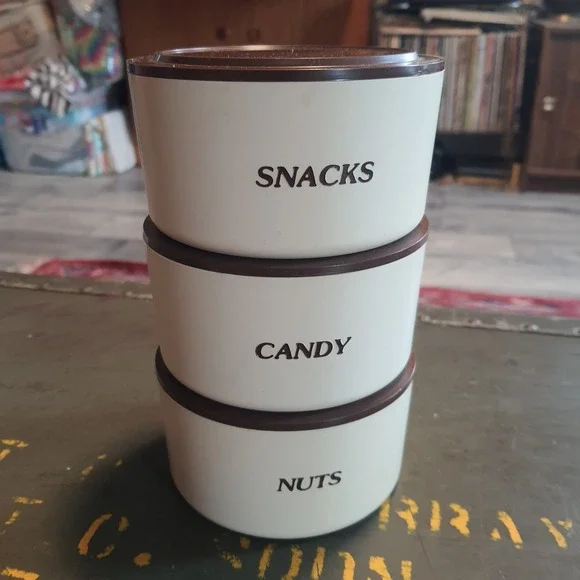 This set of three vintage Stanley Home Products canisters is perfect for storing food and other kitchen essentials. The cream and brown color scheme, along with the solid pattern and round shape, gives these canisters a retro vibe that is perfect for a bohemian or mid-century themed kitchen. The canisters are made of durable plastic and come with lids that make them stackable for easy storage.