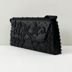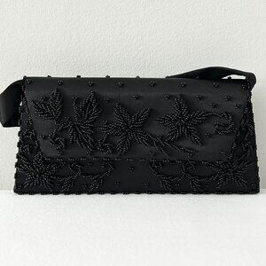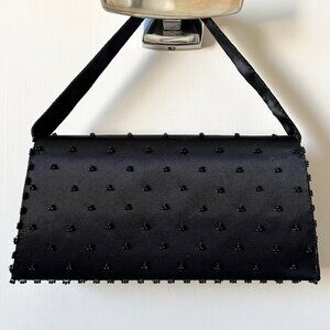 Vintage Star Brand black beaded handbag purse in good condition. Clean, no rips or tears. Beads appear to be all intact. Snap button close, satin strap. Interior side pocket with zip close. Structured bag, approximately 8.5” wide, 4” tall, 1” deep with a 4” strap drop. Perfect for your upcoming holiday party. Please ask any questions before purchasing.