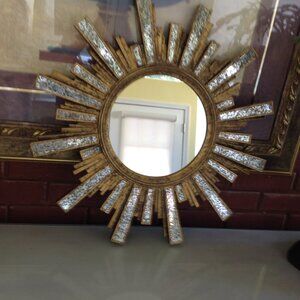 Beautiful Star Burst Accent Mirror. Excellent Condition- No chips or cracks. Appropriate for Bedroom, Dining Room, Hallway, Living Room or Family Room Decor. Made of a plastic/Resin material. There are no marks on the mirror. 22"diam.