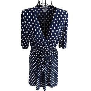 Vintage Star Vixen V-Neck Faux Wrap Tie Waist Polka Dot Dress Navy Blue Size Medium