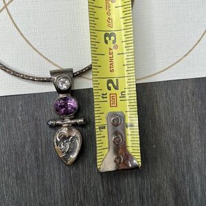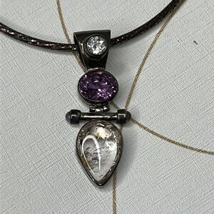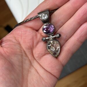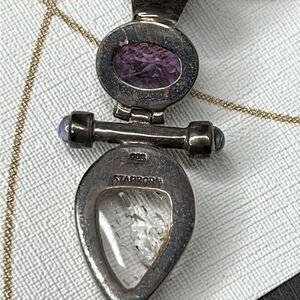 Stunning pendant! Starborn brand. 925 silver. Amethyst with another stone I am unsure of and a rhinestone which could be crystal. This piece has some minor tarnish. But could be cleaned up easily. Bottom stone is clear and has a beautiful bubble design.