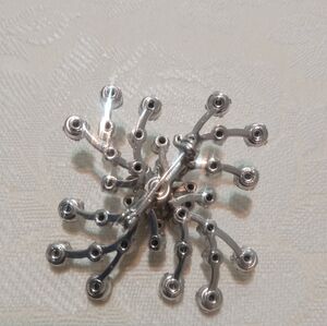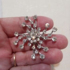 This is a beautiful rhinestone starburst design brooch. The stones are still clear and sparkly after all these years. It is constructed with rivets and is layered for a more gorgeous design. It measures 2 inches in diameter.