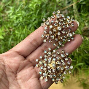 These earrings are in good condition with various florets that rotate or pivot, with no missing rhinestones and some wear on the metal. Please review all pictures before buying to avoid returns. Thank you!