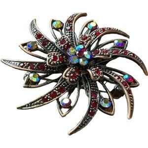 Vintage Starburst Rhinestone Brooch Pin With Red & Iridescent Crystals