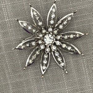Add a touch of retro beauty to your outfit with this vintage Starburst Rhinestone Brooch. The brooch features clear rhinestones that sparkle in the light, giving it a glamorous look. The silver-tone metal and intricate design make it a perfect accessory for any occasion, whether it's a birthday, anniversary, Mother's Day, or Christmas. This brooch is a unique piece of vintage jewelry that will make a great addition to your collection. It has not been customized and comes with no seller warranty. The brand is unknown, but the quality and beauty of the brooch speak for themselves. Make a statement with this stunning accessory and add a touch of vintage charm to your wardrobe today.