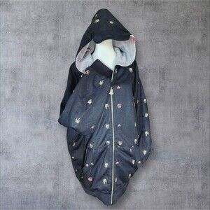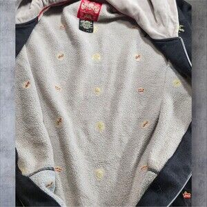 Soft fleece interior, hood lined with gray and red velvet and small built in brim