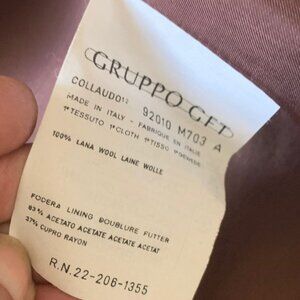 Deep chocolate brown and fully lined. The coat is generous in size and ties with a belt - it flares and has a slit up the back. Sleeves were cuffed, they can be worn uncuffed. Two deep lined side pockets.