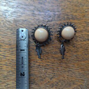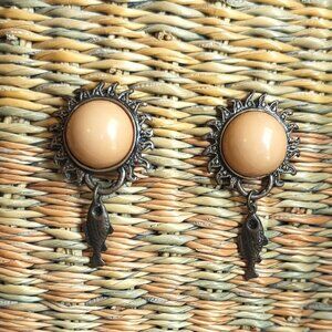 Vintage Starburst Circular Earrings. Peach Colored Faux Pearl. Metal Fish Totem. Dangle Costume Jewelry Cocktail Jewelry Pierced Post