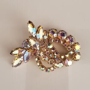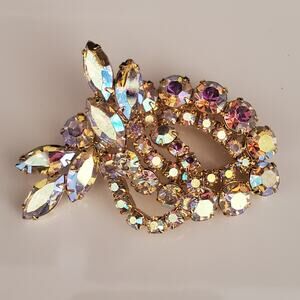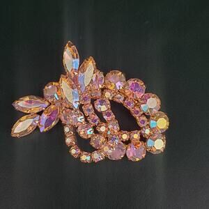 Vintage brooch is 2 1/2 inches x 1 1/2 inches and has prong set aurora borealis stones in a gold tone setting. Sparkles in shades of pink and gold. Very good condition.