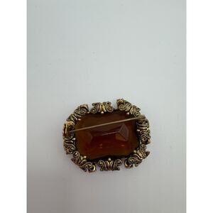 Vintage Statement Brooch – Large Amber Glass Stone with Ornate Brass Filigree