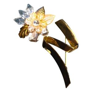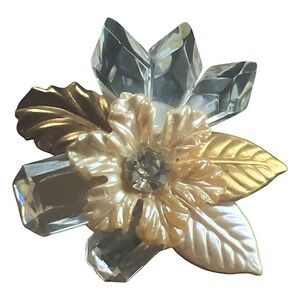 This is a gorgeous vintage piece -about 2” long with a stunning Pearl like Flower surrounded by beautiful gold leaves and crystal stones.