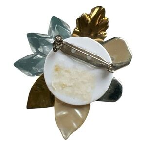 Vintage Statement Brooch Pin Pearly White Flower with Gold Leaves and Clear Crystal like Stones Classic Trending Design
