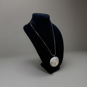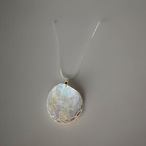 This Vintage Statement Mother of Pearl/Abalone Shell Round Pendant features a beautiful gold floral design, making it a unique and eye-catching piece of jewelry. The natural multicolor Mother of Pearl and Abalone shell used in the pendant adds a touch of elegance and sophistication to any outfit. The pendant is designed in a statement style, perfect for those looking to make a bold fashion statement. With a 24-inch necklace length, this unisex pendant is a versatile and stylish addition to any jewelry collection.
