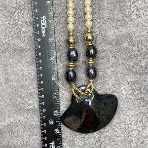 Vintage Statement Necklace Faux Pearl Beaded Gold Tone Black Iridescent Shell Pe
