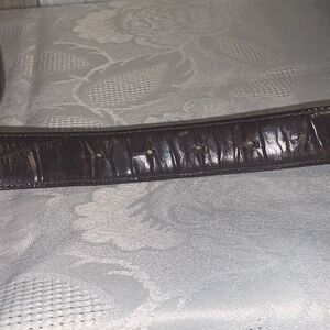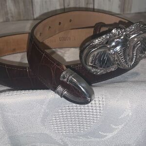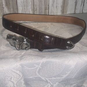 Croc embossed brown leather women’s belt with silver elephant buckle. Excellent vintage condition.