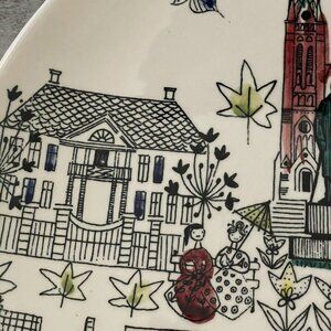 Scenes from the city of Skien decorated this vintage souvenir plate made in Norway in the 1960s. Fanciful colors and ovoid shape measuring 10" x 10".