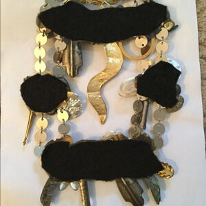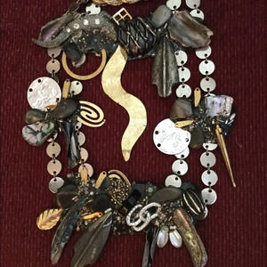 NWOT Real Vintage Large Steampunk bib handmade up-cycled necklace jewelry Y2K. Artist name is Kyra. Looks like a combination of gold, silver and gray, metallic colored Bakelite-like plastics, metals and beads. Rope like chain, Ties around neck with a metallic gold rope chain. I’ve owned this beauty for 32 years. I’ve never worn it but I’ve always loved the artsy aspect of it. Looks really cool against black. Measures 8” tall x 6 1/2” wide, plus rope tie chain. Gorgeous and unique, one of a kind necklace! Great gift! Will ship right away. Check out my other designer items
