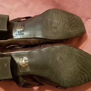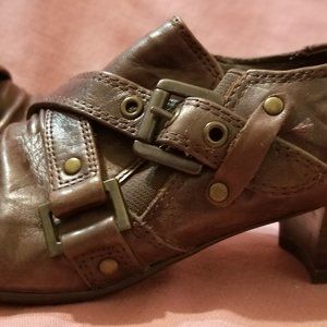 These vintage Janet D Shoes are from the 1990s. Size 7 US/37 EU. Leather uppers, distressed brown, 1-1/2" heels, really cool steampunk style. Great for work or play. Excellent condition.
