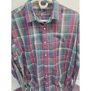 This Vintage Steeplechase Shirt is a men's large button-down with a classic tartan plaid design, perfect for a casual or business occasion. Made from a comfortable blend of polyester and cotton, this shirt features a collared neckline, long sleeves, and a regular fit. The 90s theme adds a retro touch to the overall look, making it a unique addition to any wardrobe. Easy to care for with machine washable instructions, this shirt is versatile for all seasons and includes a convenient pocket detail. With a chest size of 46 inches, this shirt is a great choice for those looking for a stylish and timeless piece.