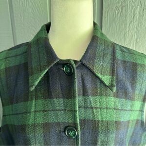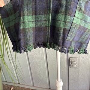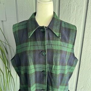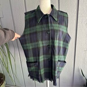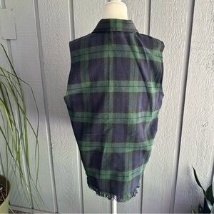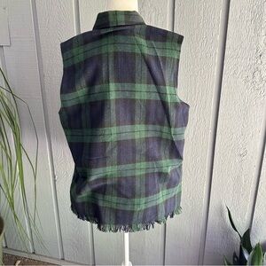 Vintage Stefano International Plaid Sleeveless Button Up Shirt Blue Green Tartan Fringe at Bottom Blackwatch 80s 1980s Grunge