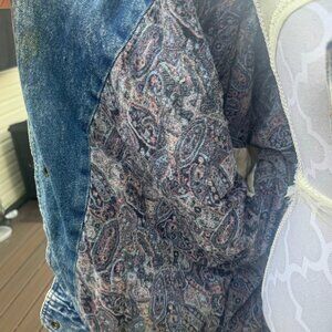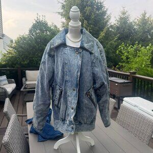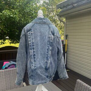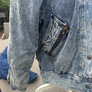 Statement 80s/90s acid wash denim jacket with bold vertical stripes, silver hardware, zip and snap closure, and oversized biker-style collar. Paisley inner lining gives it a hidden vintage touch. Zippered front pockets and cuffs add edge. Tag says M, fits slightly oversized. Iconic streetwear piece in great condition for its age.