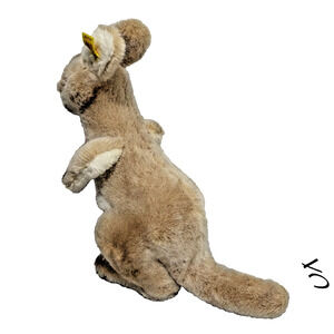 Vintage Steiff Mohair Kangaroo & Plastic Baby Joey in the pouch - Stuffed Animal - collectible plush toy with yellow Ear Button Tag. Appears to be in good condition - not mint - leans forward and needs to be propped to stand but no significant damage or flaws.