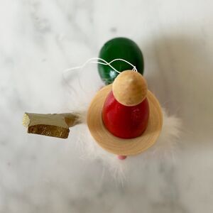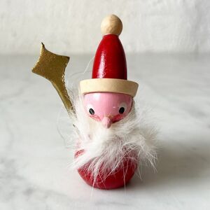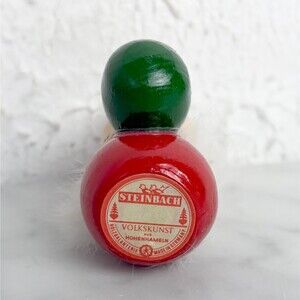 Vintage Steinbach Santa Claus Ornament. Wooden Santa has a fuzzy beard, carries a green bag and a gold scepter. The scepter is a separate piece that fits in a hole on the side, and is not glued. Classic wooden ornament made in Germany has the paper Steinbach label on the bottom. It measures 3-1/4" high and 1-1/2" wide. It is in excellent condition.