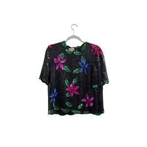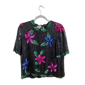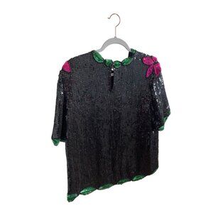 Vintage Stenay Black Sequin Floral Top With Pink Green & Blue Embellishments Sho