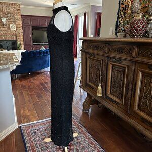 Vintage Stenay Black Silk Beaded Halter Cocktail Gown. Women's Size 8. Made in India. This combination of silk and beading drapes elegantly. High neck with alternating sheer and beaded sections. Zip and hook eye closure at back. 21" high slit at back. Lined. Classic feminine silhouette for any formal occasion. Great condition with a few spots where threads have come loose and beads have fallen off. Smoke-free home.