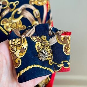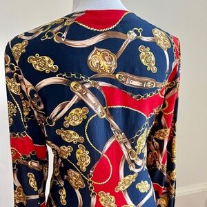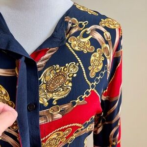 Vintage Stephanie Andrews 100% Silk Equestrian Print Navy and Red Button Down Blouse Shirt