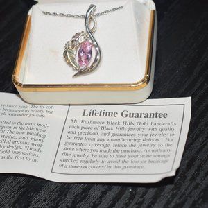 Hello, welcome to my listing. Up for sale are these pretty vintage sterling silver 12k. black hills gold necklace and ring, size 7. They both come in their original boxes, they both come with warranties. They are in excellent condition. Only been worn a few times. Both are marked sterling 12k. The chain is 18 inches and marked 925 for sterling silver. They both have pink CZ stones, the pendant is very large 1 3/8th of a inch. The ring is smaller. But both go together very well. Would make a great gift. Nice wearable collectibles for a low price. If you have any questions, please ask. Thank you and Happy Holidays.