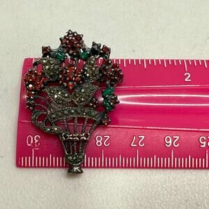 Vintage Sterling Brooch Pendant Flower Basket Marcasite-Garnet-Green Quartz Pin