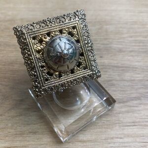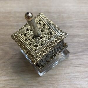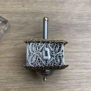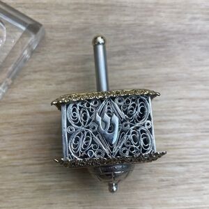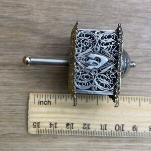 Beautiful vintage sterling silver filigree Dreidel. The top and bottom are pressed aluminum with delicate flowers and a gold tone and the body is sterling silver filigree. Not stamped. A perfect Judaica collector’s piece! In excellent condition. Comes with stand.