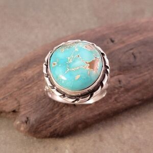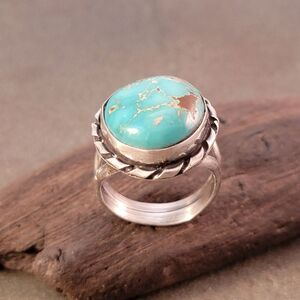 Vintage Sterling Navajo Blue Turquoise Round Cab Cable Bezel Set Ring