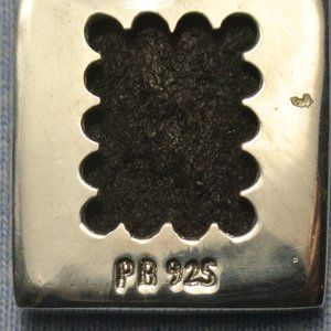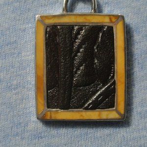 @designsnmind The, the silver is 952. The beads are turquoise, the necklace is leather. The toffee colored inlays are some sort of stone, it's not resin.. The middle has a tree carving so, it's black. It's probably some sort of wood possibly petrified wood, possibly dyed petrified wood. The Peyote Bird catalog will show some of the materials - it's handmade, and most likely from the 70's... it fits more what they were making back then.