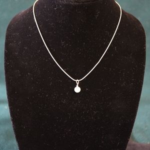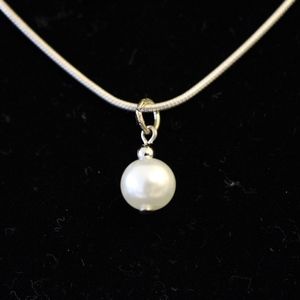 Vintage Pearl Pendant Drop Necklace weighs 1.0 grams, is 8.5mm round, to error on conservative side I would say this is a faux pearl versus a Cultured Pearl. The Sterling Chain is 18" long, weighs 6.15 grams & is marked on the clasp with a 925 stamp. The chain design type is called a Snake Chain.