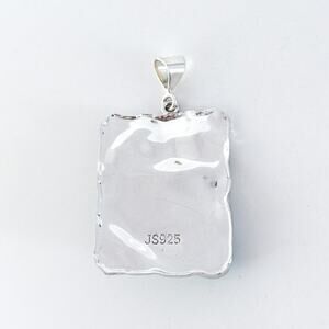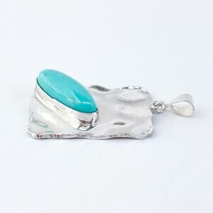 This artistic vintage pendant features a marbled turquoise cabochon set on a high-polish, abstract rectangular sterling silver base. The flowing surface adds a modernist touch, contrasting beautifully with the natural stone’s calming blue hue. Ideal for casual and creative looks, this piece blends vintage charm with bold design.