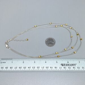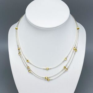 A delicate 1990s three-strand necklace featuring shimmering yellow cat’s eye glass beads with a luminous glow, spaced between fine sterling silver accents.