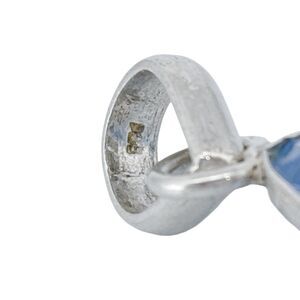 This stunning vintage pendant showcases a large, faceted blue spinel in a bold square cut. The rich blue hue of the gemstone beautifully contrasts with the sterling silver setting, creating an eye-catching statement piece. Perfect for both casual and formal occasions, this timeless design adds elegance to any ensemble.