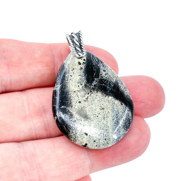 Our teardrop pendant showcases an earthy Apache Gold stone set in sterling silver.