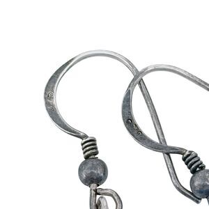 These vintage earrings feature stunning swirled blue glass stones, artistically arranged to create a flowing, dangle design. The sterling silver accents add a timeless charm to these statement pieces, perfect for adding a touch of elegance to casual outfits or as a vibrant accent for evening wear.