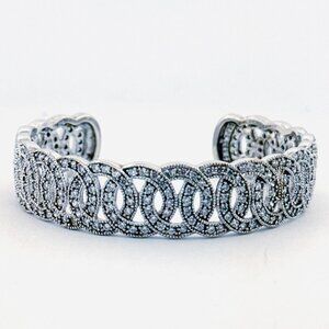 The interior is beautifully detailed with openwork patterns, and the bracelet is hallmarked ESPO 925 CZ, confirming its authenticity and metal content. With a substantial weight of 39.5 grams, this piece feels as high-quality as it looks. The bracelet measures approximately 15.5mm in width, and fits wrists with an inside circumference of about 7.85 inches.